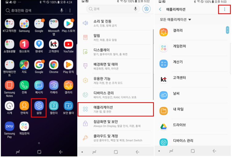 다운 받은 파일을 실행하면, 보안문제가 발생합니다. 임시로 풀어줘야 합니다. [설정] > [애플리케이션] > [메뉴]로 들어갑니다.