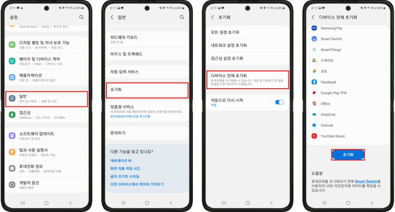 스마트폰 제조사마다 이 방법은 조금씩 다릅니다. 갤럭시의 경우에는 [설정] > [일반] > [초기화] > [디바이스 전체 초기화] > [초기화] -> 모두삭제 로 진행해 주시면 됩니다.