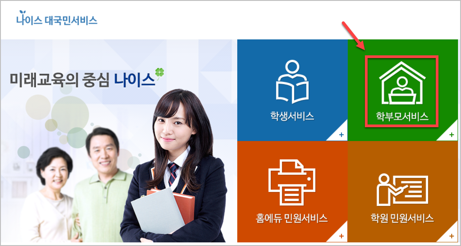 해당 링크로 들어가면 위와 같은 화면으로 들어가실 수 있습니다. 우측 상단을 보시면 '학부모서비스'라고 되어 있습니다. 이걸 클릭하시면 아래와 같은 화면이 나오게 됩니다.