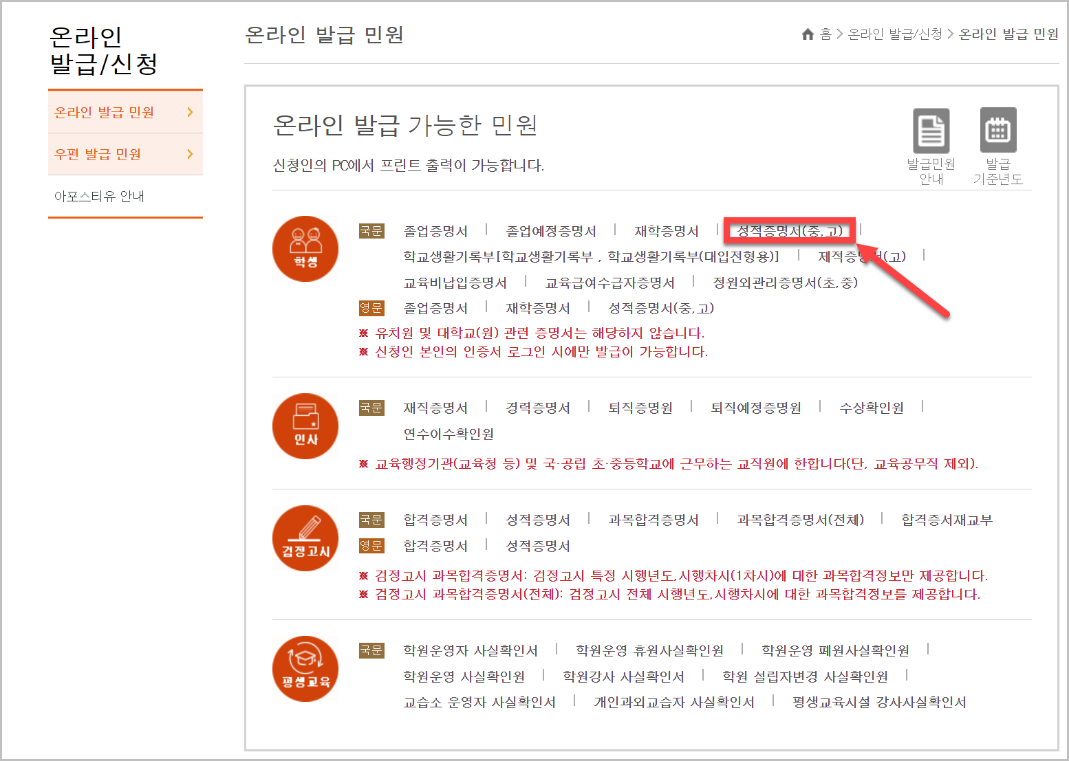 우측 상단을 보시면 성적증명서(중,고)라고 되어 있는것을 볼수 있습니다. 2003년 이후로 발급이 가능하다는 메세지가 나오게 됩니다.