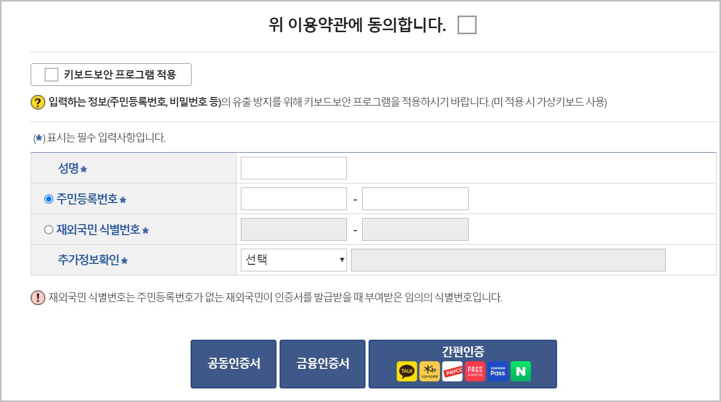 3) 공동인증서 또는 여러가지 인증방법을 통해 인증을 하시면 됩니다.