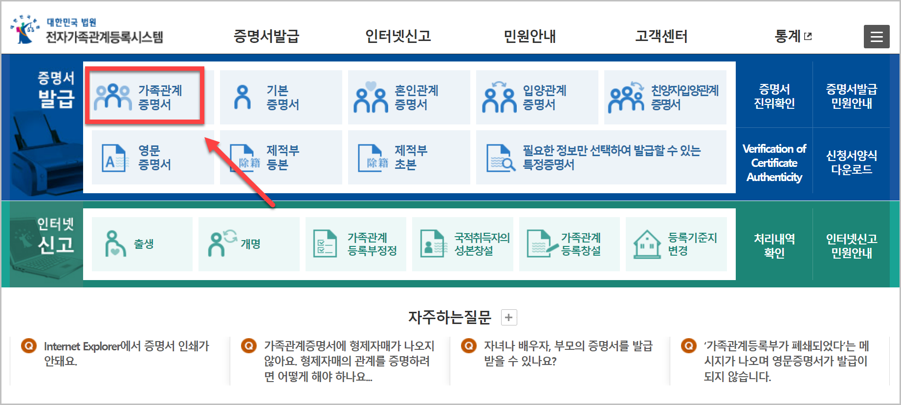 위와 같은 화면이 나오게 되면 왼쪽 상단에 가족관계증명서라고 나와 있습니다. 가장 많은 사람이 발급받기 원하니까 잘보이는곳에 위치해 있는것으로 생각이 되네요.