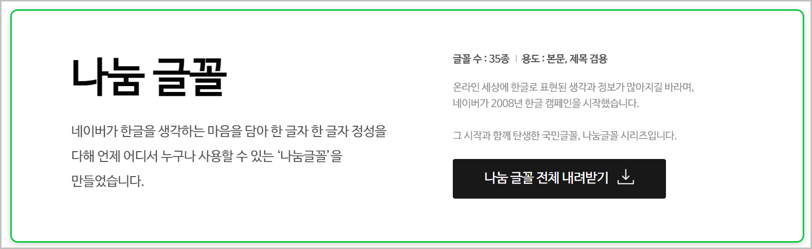 네이버 나눔고딕은 Naver에서 개발한 한글 글꼴입니다. 한글과 영문 모두를 지원하며, 굵기와 스타일의 다양한 옵션을 제공합니다.