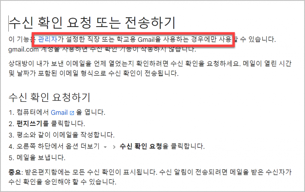 그러나 Gmail을 한국 사용자가 이용할 때 불편한 점이 있습니다. 편지 읽음 확인, 즉 수신 확인이 제공되지 않습니다. 정확히 말하면 기업 서비스 사용자의 경우 일부 가능하지만 개인 사용자는 수신여부를 알 수 없습니다. 이에 대한 자세한 내용을 구글에서는 아래 도움말로 제공하고 있습니다.