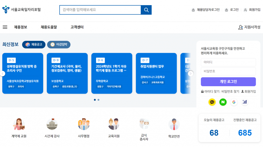새롭게 만들어진 사이트는 바로 '서울교육일자리 포털'입니다. 이곳에서는 이전과 마찬가지로 수도 내 계약제 교원부터 시간제 강사, 사무행정, 급식종사자나 학교 안전과 같은 학교 일자리 공고가 올라옵니다.