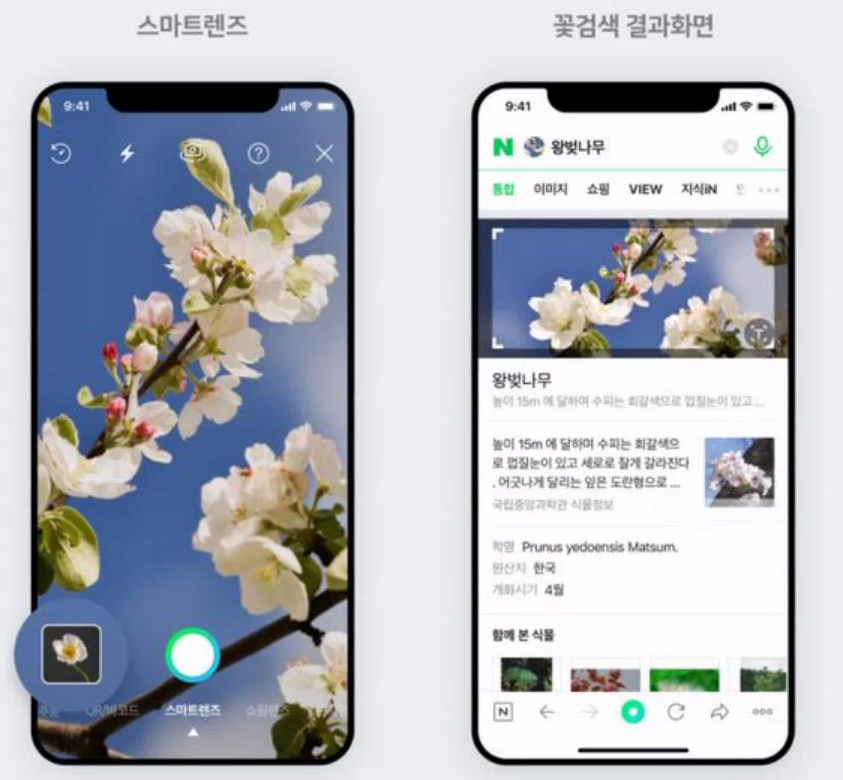 이걸 활용하며 너무 쉽게 확인할수 있습니다. 위 이미지의 왼쪽처럼 사진을 찍으면 오른쪽 처럼 결과가 나오는 것이지요. 왕벚나무가 잘 나오고 있씁니다. 이처럼 스마트렌즈가 찍은 사진을 분석하면 통합 검색 결과에 꽃 이름을 넣어줍니다. 즉, 사진만 찍어도 원산지, 개화 시기 등 종합적인 정보를 얻을 수 있습니다. 만약 확실하지 않으면 비슷한 것이라도 올려줍니다. 또한 지금까지의 히스토리도 자동으로 저장됩니다.