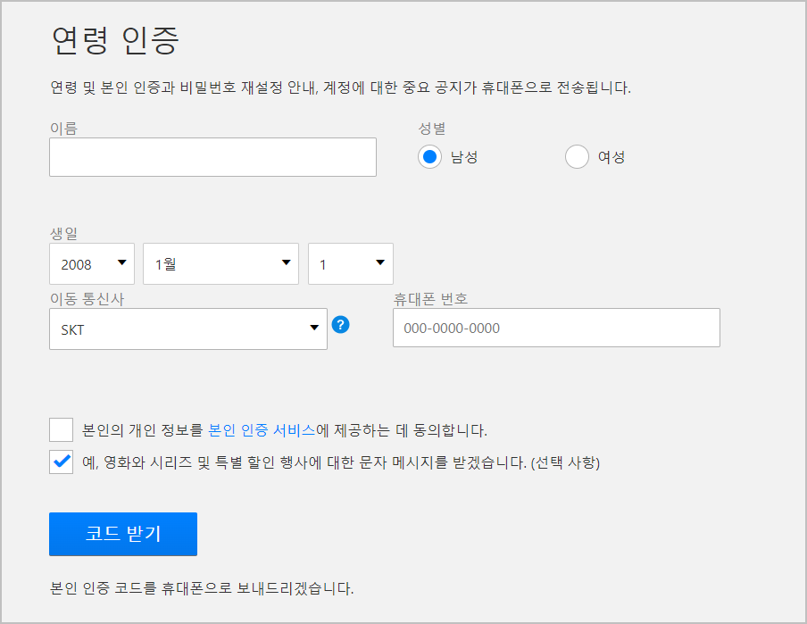 해당 페이지로 들어가면 이러한 화면이 나옵니다. 우리가 평소에 지겹도록 많이한 본인인증과 거의 비슷한 형식으로 되어 있습니다. 다만 성별이라던가 그런게 조금 다를 뿐이지요. 진행하는것은 큰 문제가 없으리라 생각합니다. 하지마 이게 잘 안되면 다음을 확인해 보세요.