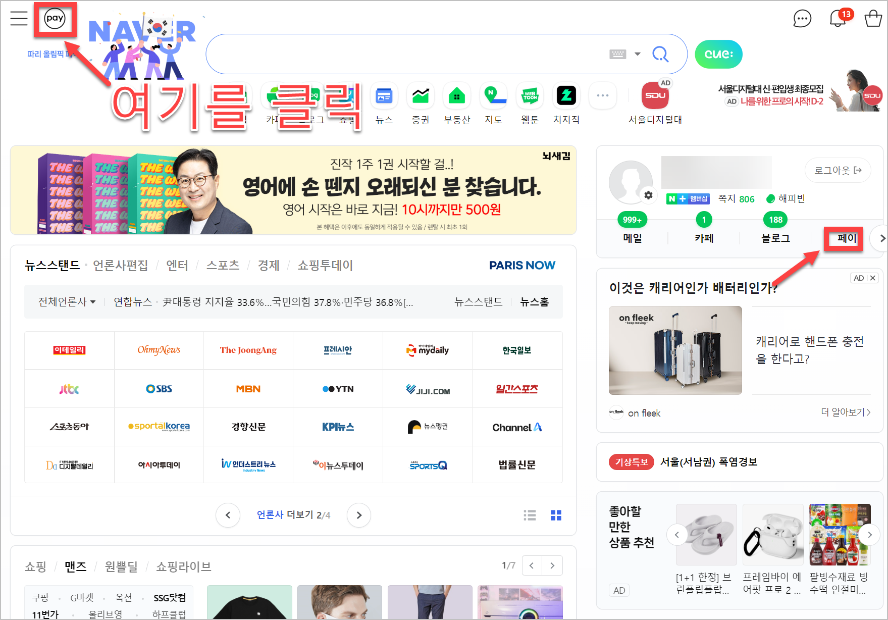 먼저, 웹사이트에 접속하거나 앱을 실행하세요. 네이버 계정으로 로그인하셨다면, 화면 상단에 위치한 ‘네이버 페이’를 찾을 수 있습니다. 위의 이미지는 웹사이트 기준이긴하지만, 앱으로 접속해도 크게 다르지 않습니다. 비슷한 위치에 동일한 아이콘이 있습니다.