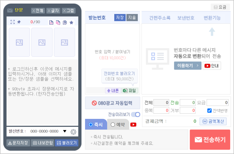 요금 체계는 다양한 옵션이 있어 복잡해 보일 수 있지만, 기본적으로 단문은 건당 25원, 장문은 50원, 그림은 별도로 책정되어 있습니다. 다만 포인트 적립이나 대량 발송 시 할인 혜택이 있어 실제로는 이보다 저렴하게 이용할 수 있습니다.
