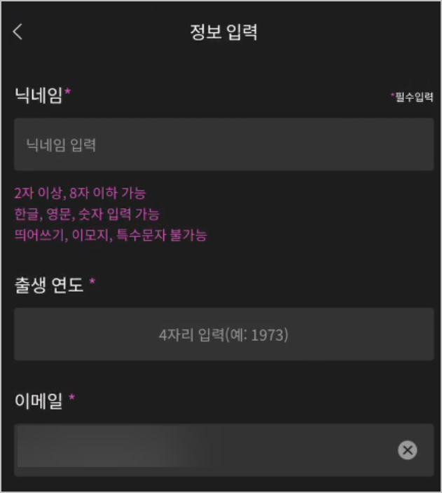 보라색 별표 옆에 있는것은 반드시 입력을 해야하는 것 입니다. 닉네임은 댓글을 달때 보여지는 것입니다. 출생년도는 4자리로 입력을 해야하고, 기본적으로 이메일은 적어져 있습니다. 하지만 자주 쓰는 이메일로 바꾸는것을 권해드립니다.