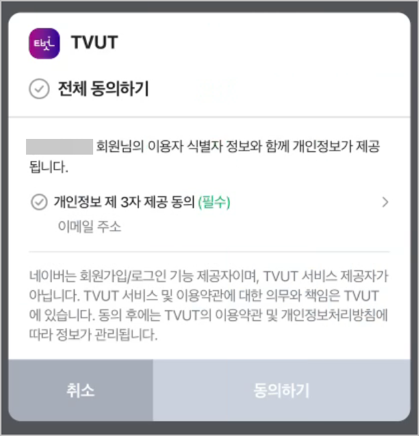 하지만 전 이미 카톡으로 가입을 했기 때문에 네이버로 시도를 해보겠습니다.로그인을 하게되면 위와 같이 동의를 받는 과정은 카톡도 동일합니다. '전체동의하기'를 터치하고 하단에 '동의하기'를 누르시면 됩니다. 이것은 네이버에 제출하는 동의서입니다.