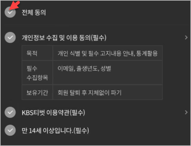 한번 더 동의를 해야합니다. 이것은 kbs티벗에 제출하는것이지요. 2가지 모두 완료를 하게 되면 이제 본격적으로 회원가입을 하게 됩니다. 회원가입의 과정은 그렇게 어렵지 않습니다. 과거에는 말도 안되게 복잡했는데, 어플이 개선되고 나서는 너무 쉬워졌습니다. 그냥 하나하나 입력을 하시면 됩니다.