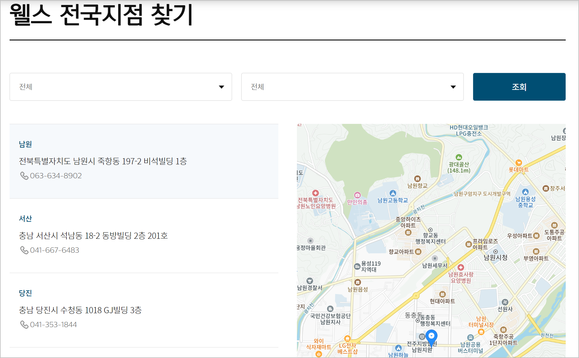 직접 점검이나 서비스가 필요할 경우, 전국 지점 찾기 기능을 이용해 가까운 지점을 방문할 수 있습니다. 교원웰스 홈페이지에서 [전국 지점 찾기] 메뉴를 선택하여 지점을 확인하고, 지도를 통해 위치를 쉽게 파악할 수 있습니다.