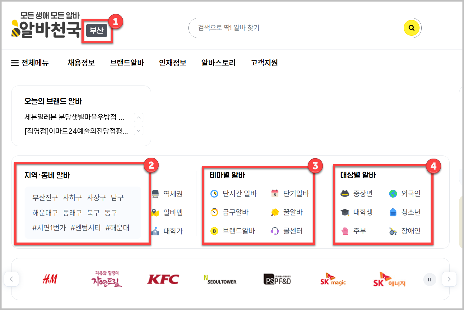 ③을 보시면 컨셉별로도 확인할수 있어요. 단기, 단시간 뿐만아니라 급하게 구하는 것도 찾아볼수 있도록 분리되어 있습니다. 그리고 사람들이 많이 찾는 콜센터도 별도로 모아두었네요.