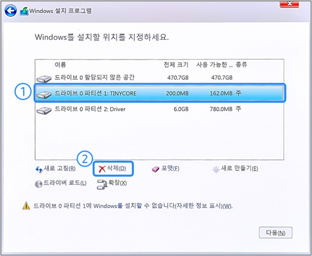 6) 설치유형에서는 '사용자지정'을 합니다. 그러면 아래와 같은 화면이 나올가능성이 많아요. 아래 화면에서 파티션 1은 리눅스니까 선택해서 삭제해줍니다. 드라이버는 삭제하지 마세요.