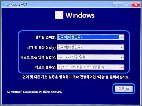 3) 윈도우 설치화면에 진입하게 되면 터치패드나 키보드로 해야합니다. (터치패드도 안될수있음) 여러가지 언어적인 기본적인 셋팅을 하고, "지금 설치"를 누릅니다.