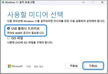 2) 다운로드 받은 파일을 실행합니다. 그리고 여러가지가 절차가 있는데, 언어는 당연히 한국어고, 윈도우는 11로 가야겠죠? 사용할 미디어는 USB 플래시 드라이브를 선택합니다.