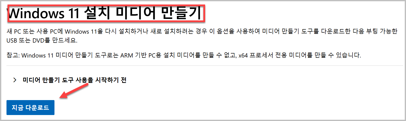 1) MS 공식 다운로드 사이트 접속해서 미디어 만들기를 선택합니다.