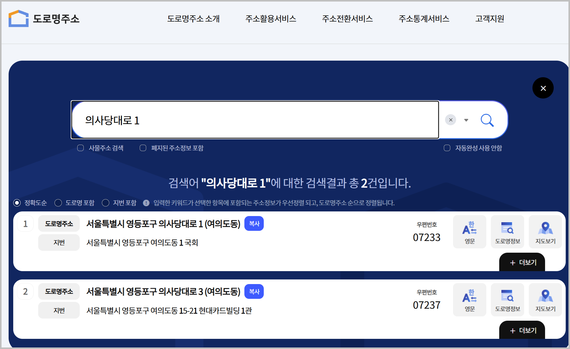 예를 들어, ‘의사당대로 1’을 입력하면 지번 주소인 ‘여의도동 1, 국회’가 정확히 나옵니다.