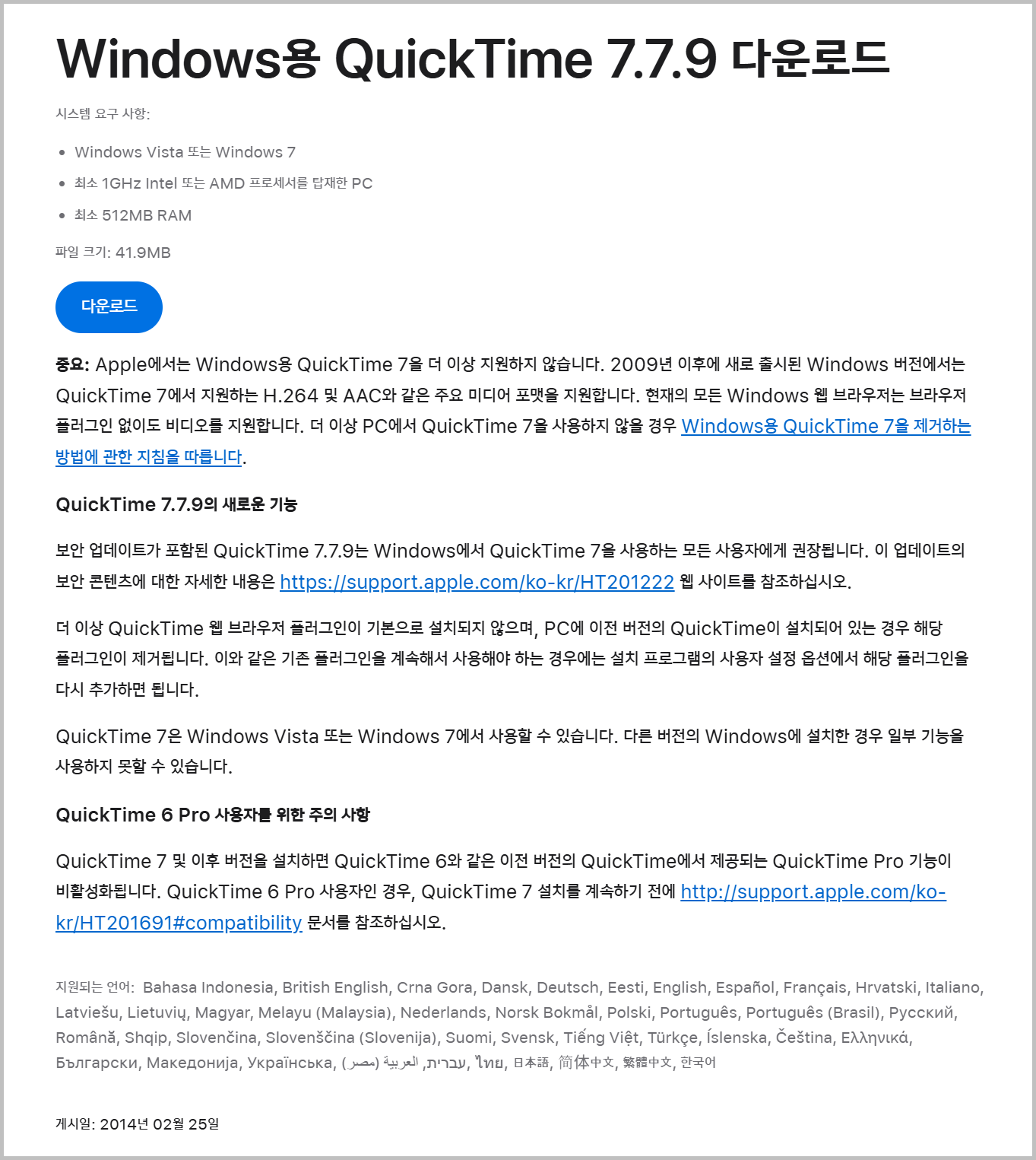 여긴 애플의 공식 홈페이지입니다. 보시면 알겠지만 2014년 이후로 더이상 업데이트를 하고 있지 않습니다. 그렇기 때문에 시스템 요구 사항도 굉장히 낮습니다.