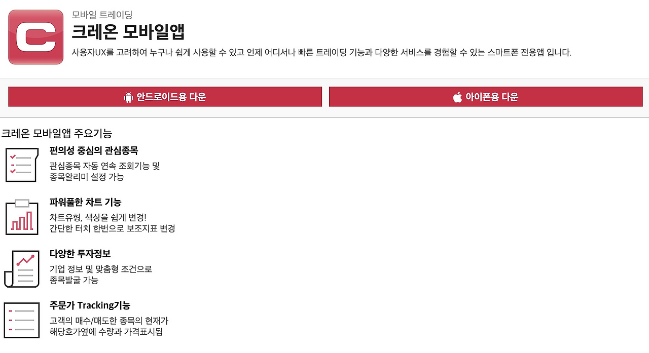 이 때문에 크레온을 이용하려면 보통 모바일 앱을 설치해야 합니다. 아이폰 사용자는 앱스토어에서, 안드로이드 사용자는 플레이스토어에서 앱을 내려받아 사용할 수 있습니다. 앱을 설치하면 스마트폰에서도 주식 거래와 다양한 투자 정보를 확인할 수 있습니다.