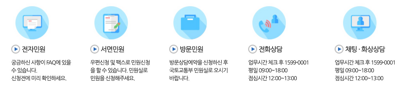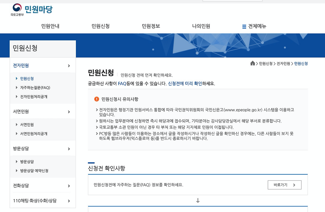 민원마당은 국토교통부 공식 홈페이지와 별도로 운영되는 시스템입니다. 그만큼 많은 사람들이 민원을 접수하고 문의를 하기 때문에 독립적인 서비스로 운영되고 있다고 볼 수 있습니다. 홈페이지에 접속하면 다양한 민원 유형을 확인할 수 있으며 여러 방식으로 문의를 남길 수 있도록 구성되어 있습니다.
