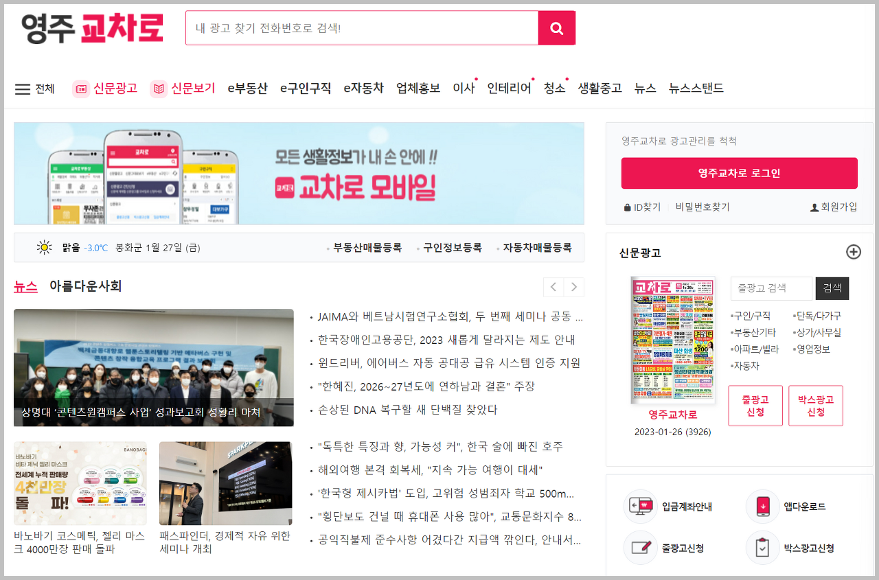 예를 들어 영주교차로 같은 사이트가 있습니다. 예전에 종이로 보던 교차로신문이 온라인 형태로 운영되는 서비스입니다. 지역 생활정보를 중심으로 다양한 정보를 제공하고 있습니다.