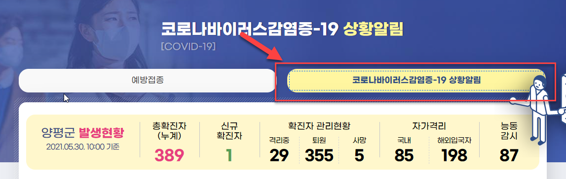 홈페이지에 들어가면 위와 같은 화면이 나옵니다. 이중에서 오른쪽 것을 누르면 코로나정보를 확인할 수 있습니다.