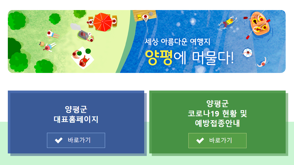 양평군청 홈페이지는 일반적인 홈페이지의 모습이 아니라 바로가기 사이트 형식으로 운영이 되고 있습니다. 이는 많은 사람들이 코로나19와 관련된 정보를 얻기위하여 유입이 되고 있는데 이들에게 편의를 제공하기 위함입니다.