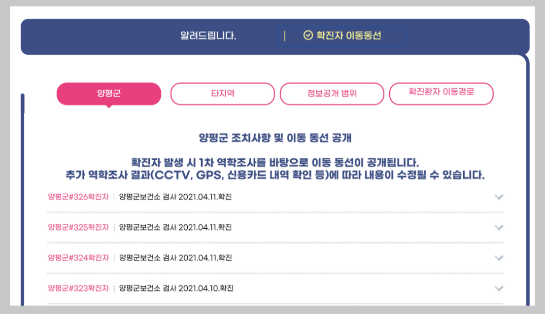 조금 아래로 내리면 확진자 이동동선을 확인할 수 있씁니다. 확진자 이동동선은 역학조사가 완료가 되어서 더이상 접촉자가 없는 것으로 판단이 되면 개인정보 보호를 위하여 공개가 되지 않습니다. 그래서 저도 펼쳐놓은 상태로 두고 있지 않았어요.