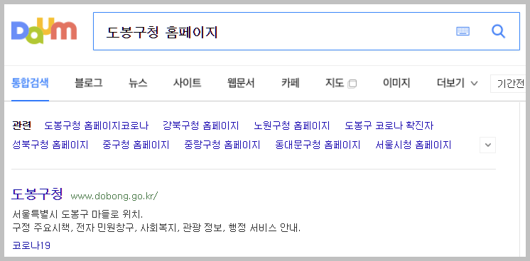 다음에서 도봉구청 홈페이지라고 검색을하면 위와 같은 검색결과가 나옵니다. 네이버에서도 똑같은 결과를 얻을 수 있습니다. 가장 맨위의 검색결과를 클릭을 하면 원하는 사이트에 들어가실 수 있습니다.