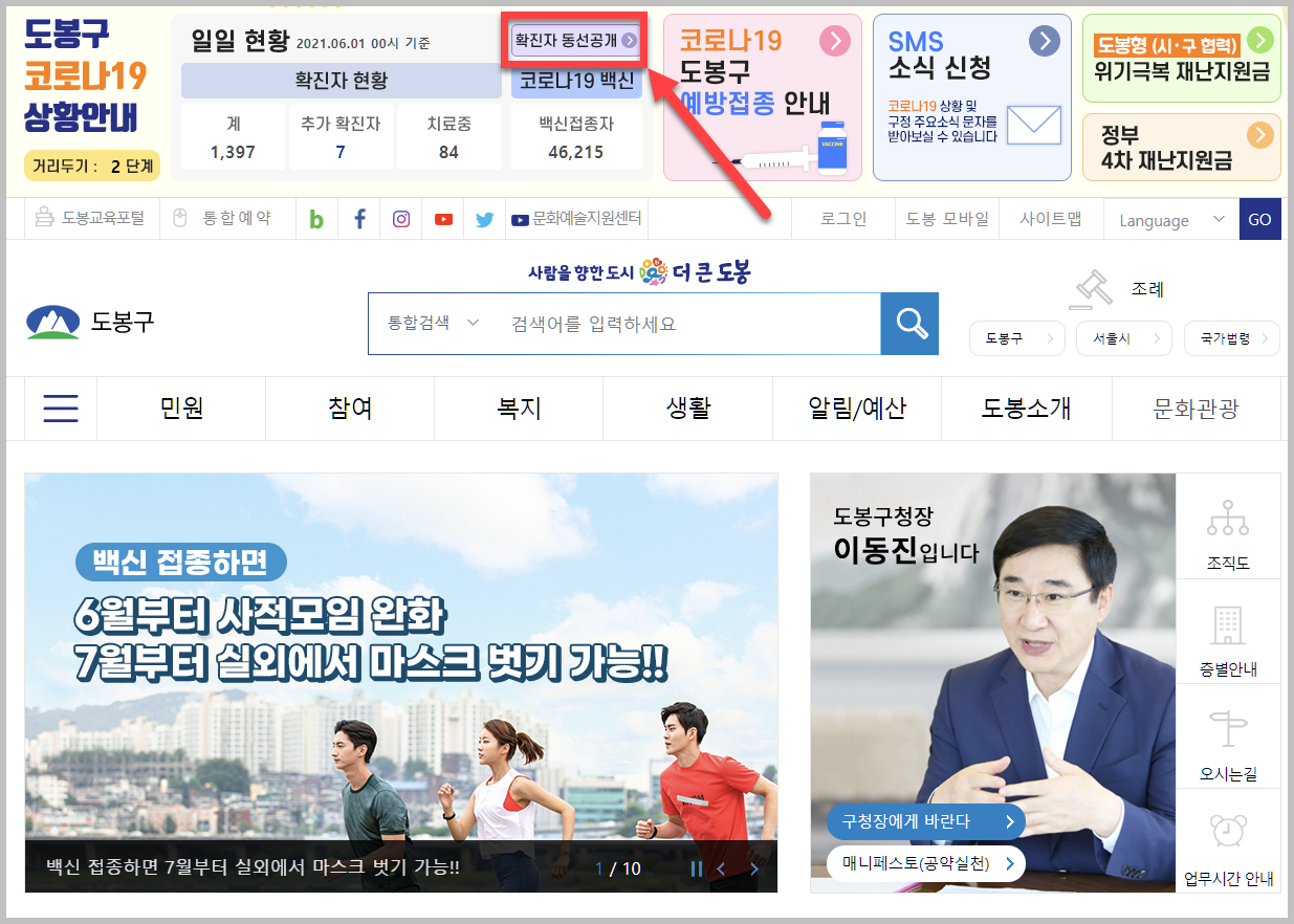 확진자와 관련된 정보를 얻는데 있어서 가장 좋은곳은 지자체 홈페이지입니다. 도봉구에 거주하시는분의 경우에는 도봉구청 홈페이지를 방문하는것이 가장 좋은 방법입니다.
