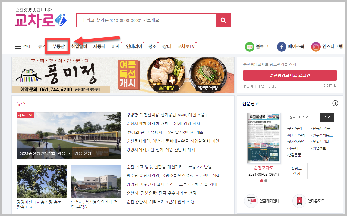 홈페이지에 들어가면 위와 같은 화면이 나오게 되는데 여기에서 메뉴에서 '부동산' 을 선택을 하면 순천교차로 부동산 정보를 확인할 수 있습니다.
