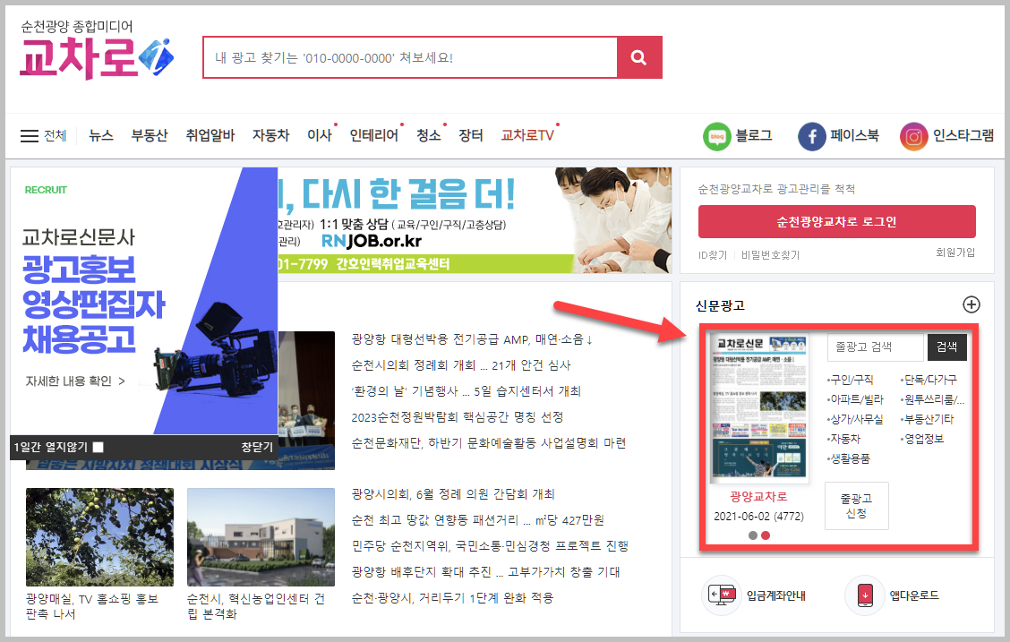 만약 줄광고 형태로 보고 싶다면 순천교차로 홈페이지 우측에 있는 신문그대로보기 서비스를 이용하시면 됩니다. 신문 형태로도 볼수 있을 뿐만아니라 줄광고를 검색할 수 있습니다.