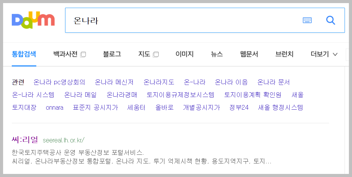 네이버와 다음에서 간단하게 '온나라'라고 검색을 하면 손쉽게 원하는 결과를 얻을 수 있습니다. 그런데 보시면 알겠지만 온나라 부동산 포털의 이름이 변경이 되었습니다. 이름은 씨:리얼 입니다. 하지만 검색엔진에서 '씨리얼'이라고 검색을하면 먹는것 밖에 나오지 않습니다. 그렇기 때문에 '온나라'라고 검색을 하는것이 편리합니다.