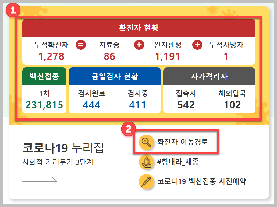 첫번째로 보이는것은 확진자 현황입니다. 지금까지 세종시에 발생한 누적확진자가 얼마나되는지, 현재 백신 접종자가 얼마나 되는지 손쉽게 확인을 할 수 있습니다. 하지만 이제는 이런것은 중요하지가 않습니다. 확진자 이동경로가 중요하지요.