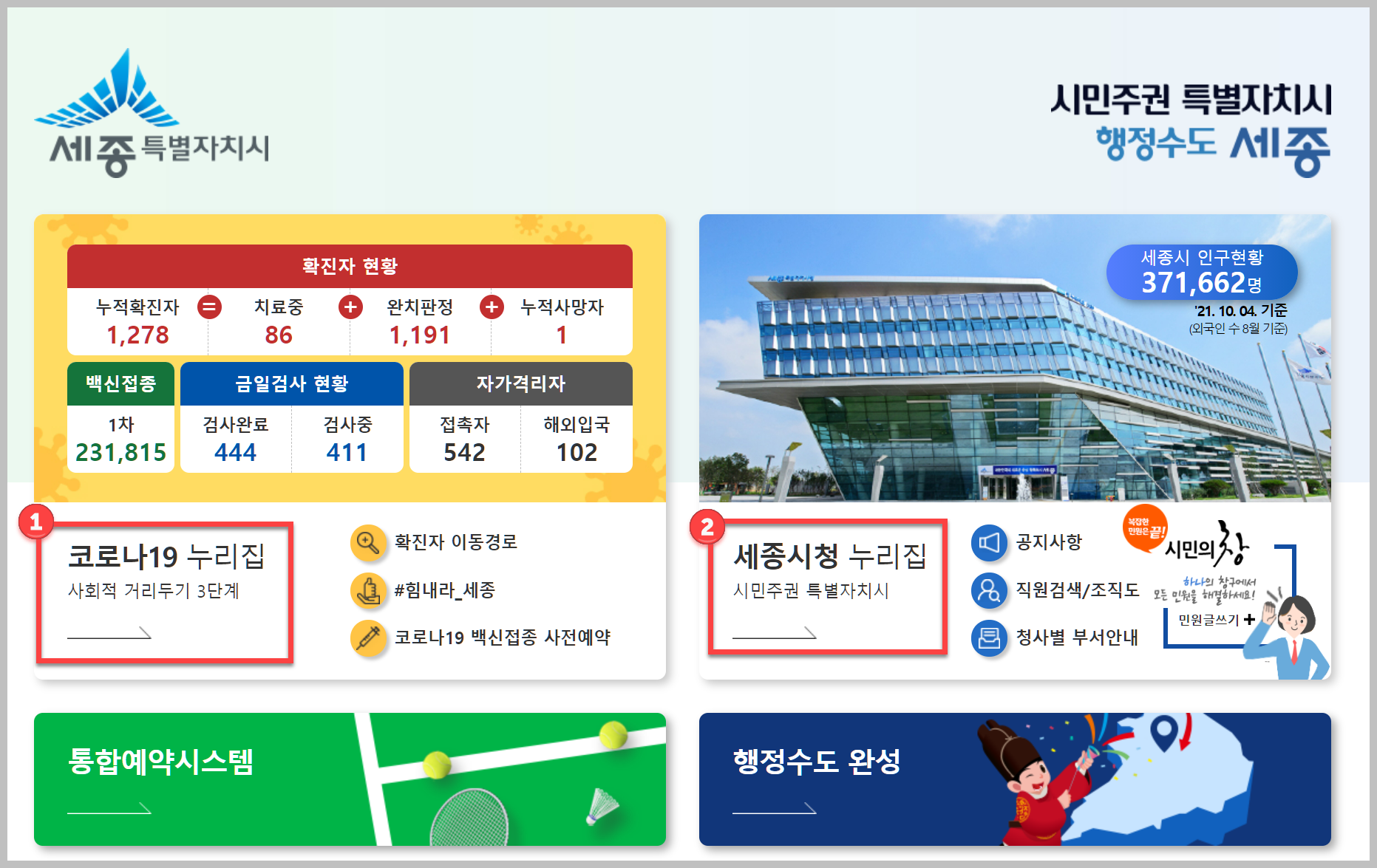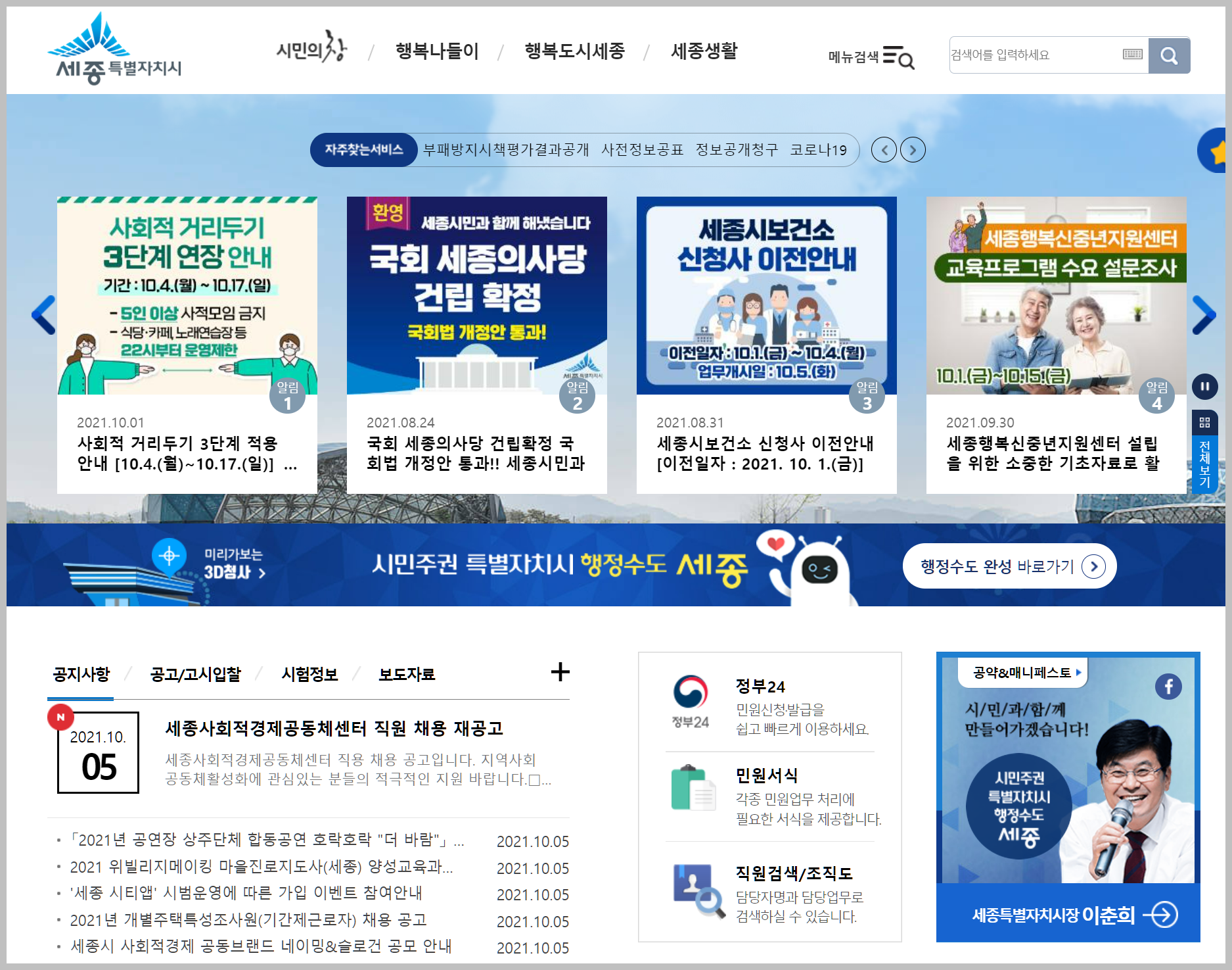 세종시청 홈페이지에는 코로나19와 관련된 정보 외에도 여러가지 정보가 있습니다. 관광과 관련된 정보를 비롯하여 여러가지 복지 등 삶과 관련되 여러가지 정보가 있습니다. 과거에는 생활정보지에서 이런 정보를 얻었다면, 요즘에는 지자체홈페이지에서 관련정보를 많이 얻게 되는것 같습니다.