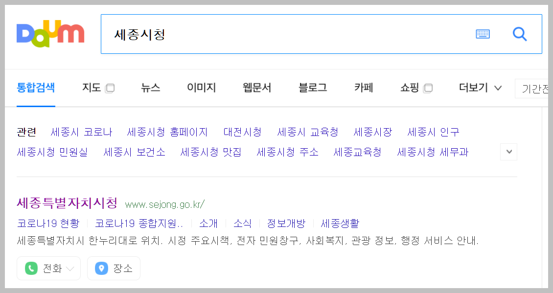다음에서 간단하게 '세종시청'이라고 검색을 하시면 위와 같은 검색결과를 볼 수 있습니다. 여기에서 가장 맨위의 것을 클릭을 하시면 손쉽게 세종특별자치시청 홈페이지로 들어가실 수 있습니다.