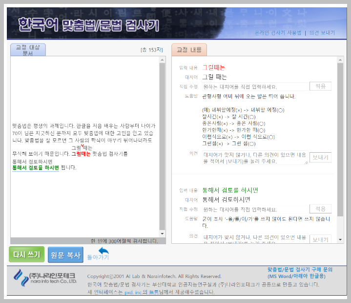 다음 맞춤법은 수정을 해주기는 하지만, 이게 왜 틀린지를 정확하게 알려주지는 않습니다. 이러한 답답함을 해결해 주는 사이트가 있습니다. 바로 부산대 맞춤법 검사기 입니다.